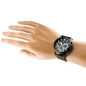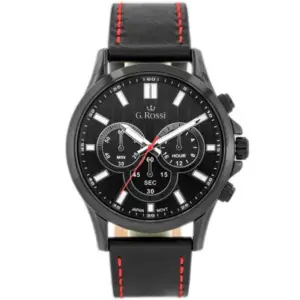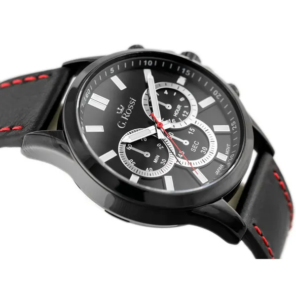 Stílusos férfi karóra klasszikus, mégis határozott megjelenéssel. A fekete számlap, a fekete tok és a fekete bőrszíj piros varrással elegáns, sportosan modern összhatást ad a mindennapi viselethez.