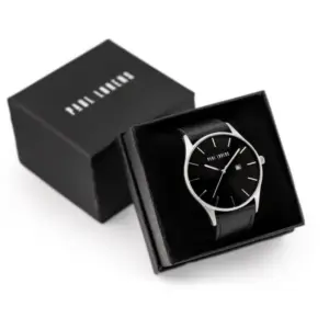 Elegáns, fekete bőrszíjas férfi karóra japán kvarc szerkezettel, dátumkijelzéssel és jól kombinálható, időtálló megjelenéssel. A 45 mm-es tok, az ásványi üveg és az ajándék díszdoboz praktikus, stílusos választássá teszi.