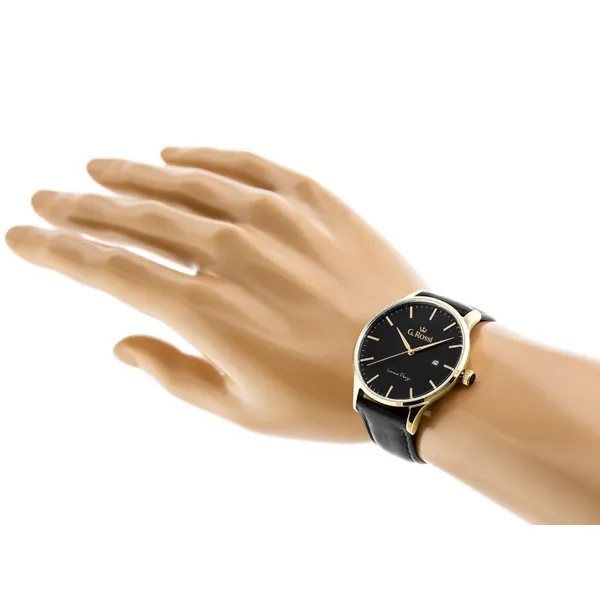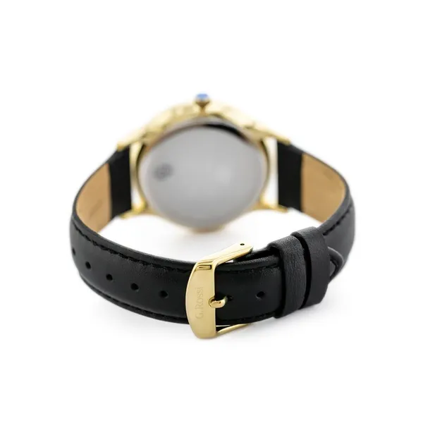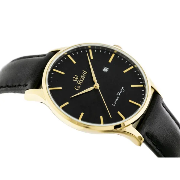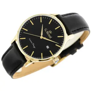 Elegáns, klasszikus stílusú férfi karóra fekete bőrszíjjal, fekete számlappal és aranyszínű tokkal. A megbízható, Japánban gyártott Miyota kvarc szerkezet pontos időmérést biztosít, míg az antiallergén IPG bevonat növeli a tartósságot és a kényelmet a mindennapi viselet során.