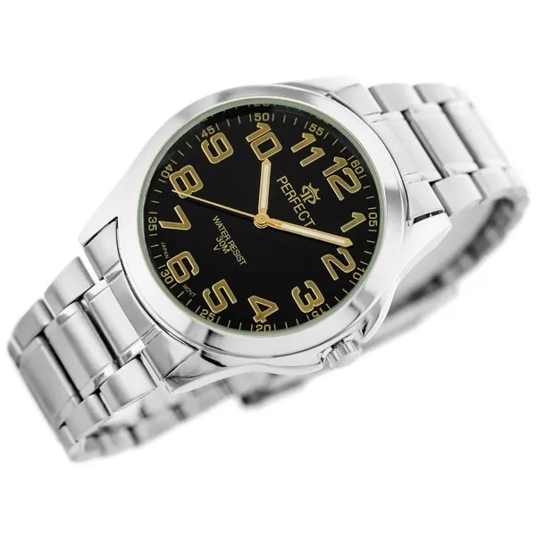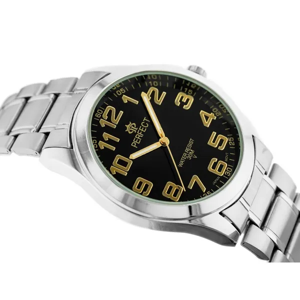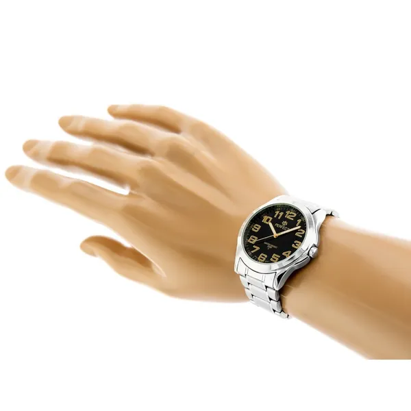 Letisztult, elegáns férfi karóra japán кварc szerkezettel, fekete számlappal és ezüstszínű fém szíjjal. Az ásványi üveg, a WR30 vízállóság és az antiallergén bevonat praktikus választássá teszi a mindennapokra.