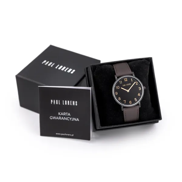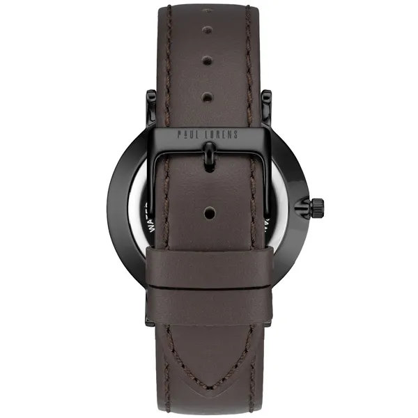 A Paul Lorens PL11989A5-1B3 férfi karóra elegáns és időtálló választás a letisztult stílus kedvelőinek. A fekete tok, a fekete számlap és a barna, varrott bőrszíj harmonikus megjelenést alkot, amely hétköznapi viselethez és alkalmi öltözékhez is jól illik. Karcsú kialakítása kényelmes viseletet biztosít egész nap.
