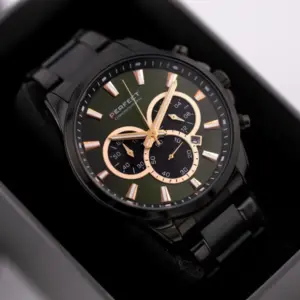 Stílusos férfi karóra fekete fém szíjjal, kronográf funkcióval és dátumkijelzéssel, amely praktikus választás a mindennapokra. A fekete számlap, a rózsaarany színű részletek és a 44 mm-es tok egyszerre biztosítanak modern megjelenést és jól viselhető karaktert.