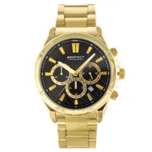 A Perfect karórák a kedvező ár, a megbízható működés és a sokoldalú stílus jó egyensúlyát kínálják. Ez a férfi modell elegáns aranyszínű kivitelével, fekete számlapjával és sportosan ható kronográf megjelenésével ideális választás mindennapi viseletre és alkalmi öltözékhez is.
