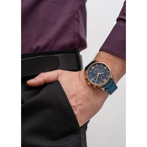 Elegáns, sötétkék és rózsaarany színvilágú férfi karóra, amely pontos kvarc szerkezettel és praktikus dátumkijelzéssel segíti a mindennapokat. A fém szíj, az ásványi üveg és az ajándék díszdoboz egyszerre teszi stílusossá és jó választássá ajándékozáshoz.