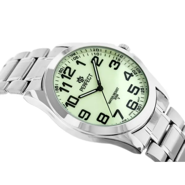 Elegáns és praktikus férfi karóra, amely a letisztult ezüstszínű fém szíjat zöld, fluoreszkáló számlappal kombinálja. A számlap előzetes megvilágítás után zölden világít, így gyengébb fényviszonyok mellett is könnyebben leolvasható. A megbízható Miyota kvarc szerkezet japán gyártású, a tok pedig antiallergén IPS bevonatot kapott a nagyobb tartósság érdekében.