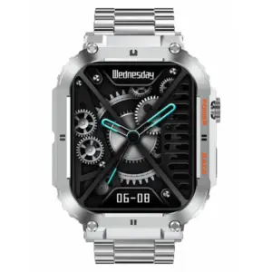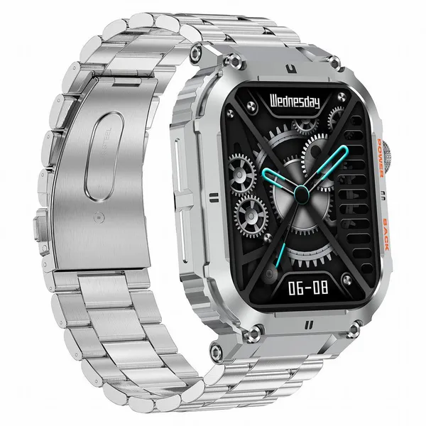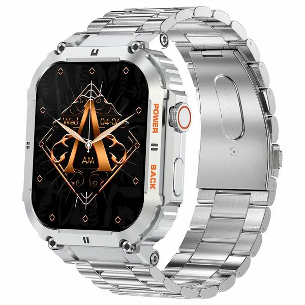 Ez a férfi okosóra nagy, 1,96 hüvelykes IPS érintőkijelzővel, Bluetooth hívás funkcióval és elegáns ezüst színű fémházzal készült. A beépített mikrofon és hangszóró segítségével közvetlenül az óráról fogadhat és indíthat hívásokat, miközben a valós idejű értesítések mindig kéznél tartják a fontos információkat.