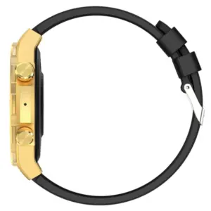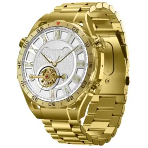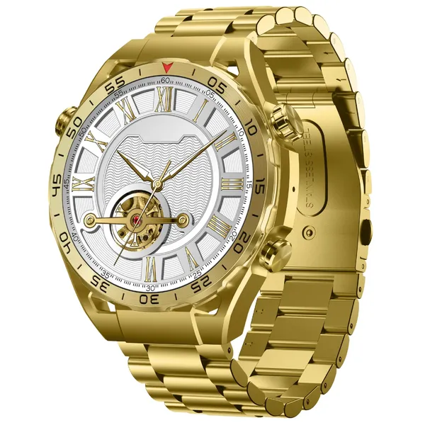 Elegáns, arany színű férfi okosóra nagy, teljes érintéses kijelzővel, pulzus- és véroxigénszint-méréssel, valamint hasznos napi értesítésekkel. Az acél karkötő és a mellékelt szilikon szíj rugalmas viseletet ad, így sporthoz és hétköznapokra is kényelmes választás.