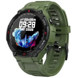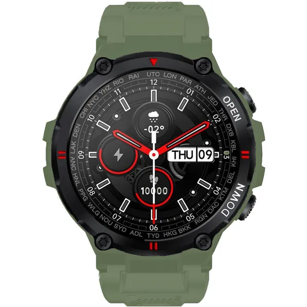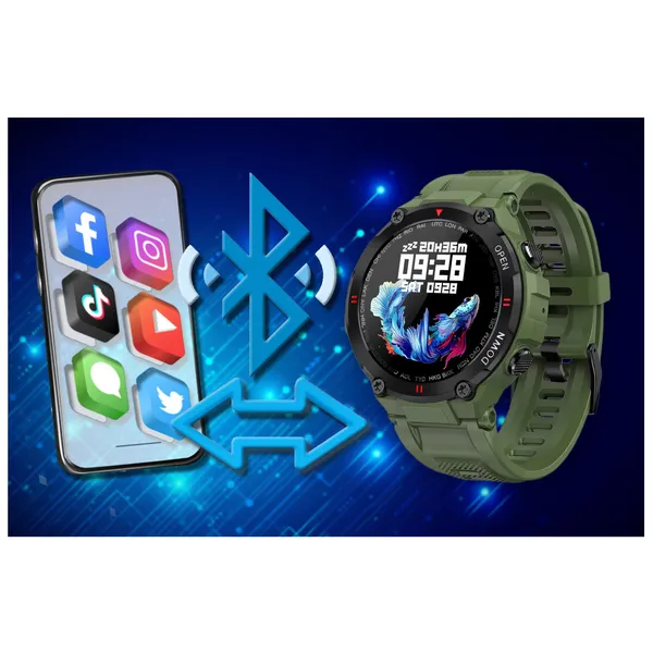 Ez a férfi okosóra praktikus társ a mindennapokban, munkához, sporthoz és utazáshoz. Az 1,28 hüvelykes, teljes érintéses IPS kijelző jól áttekinthető, a Bluetooth-hívás funkciónak köszönhetően pedig a párosított telefonról közvetlenül az órán keresztül is fogadhat és indíthat hívásokat. A zöld tok és a zöld szilikon szíj sportos, modern megjelenést ad.