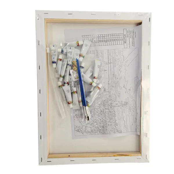 • Teljes készlet: számozott pamutvászon, akrilfesték tégelyek, 3 különböző méretű ecset, képakasztó készlet.