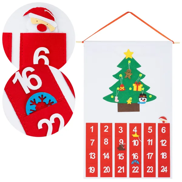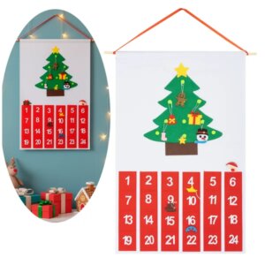 A 24 zsebes filc adveneti naptárban minden napra rejthetsz apró meglepetést, így a várakozás izgalmas és családbarát program lesz. A mellékelt fa rúd, szalag és 10 akasztható filc dísz gyors felhelyezést és látványos ünnepi dekorációt ad.