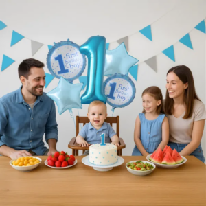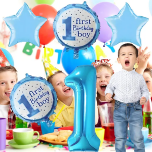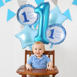 Az 5 darabos fólia lufi készlet villámgyorsan varázsol élénk kék dekorációt a kisfiú első születésnapjára, és héliummal vagy levegővel fújva fotóháttérként is feldobja az ünnepet; tartós anyaga miatt leeresztés után emlékként megőrizhető.