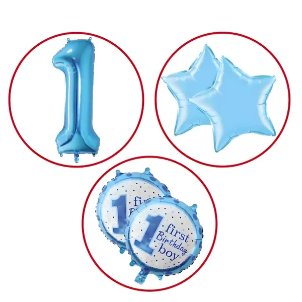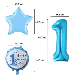 • 1 db nagy „1” szám alakú lufi, 2 db csillag alakú lufi és 2 db kerek, „First Birthday Boy” feliratú lufi.
