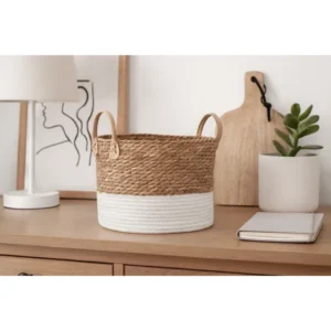 Természetes tengerifűből fonott kosarunk meleg, skandináv hangulatot áraszt, miközben rendezetten tartja törölközőidet, játékokat vagy szobanövényeidet; könnyű, mégis erős kialakítása miatt egyszerűen mozgatható és hosszú távon is megbízható.