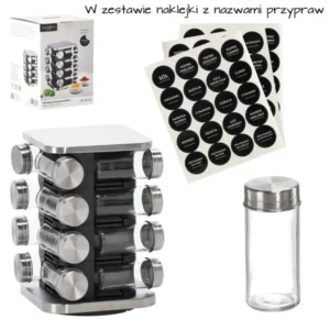 Rendezd 16 kedvenc fűszeredet átlátszó üvegcsékben, amit egy 360°-ban forgatható állványon pillanatok alatt elérsz. A tartós műanyag-acél kombináció és a mellékelt 38 matrica gondoskodik a tiszta pultfelületről, az egyszerű azonosításról és az elegáns megjelenésről.