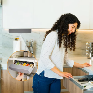 • Helytakarékos kialakítás – a fűszerek a szekrény alján „lebegnek”, felszabadítva a polcot.