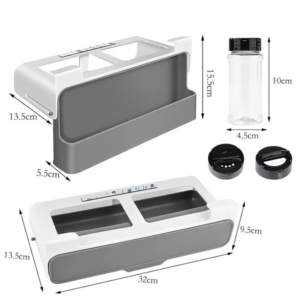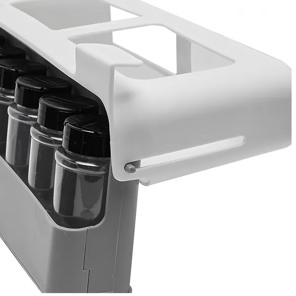 Takaríts meg értékes munkafelületet, és szerezz professzionális rendet a konyhádban! A fúrásmentes, fiókszerűen kihúzható fűszertartó 3M ragasztócsíkkal másodpercek alatt rögzíthető a felső szekrény vagy polc aljára. A 6 darab, kristálytiszta műanyag üveg gondoskodik arról, hogy mindig lásd, melyik fűszerből mennyi van még.