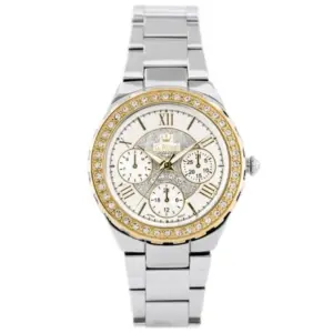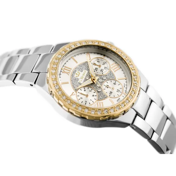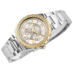 Elegáns, kétszínű női karóra, amely kifinomult megjelenésével jól illik mindennapi viselethez és alkalmi öltözékhez is. Az ezüstszínű számlap, az ezüst-arany tónusú fém szíj és a kerek tok harmonikus, nőies összhatást teremtenek.