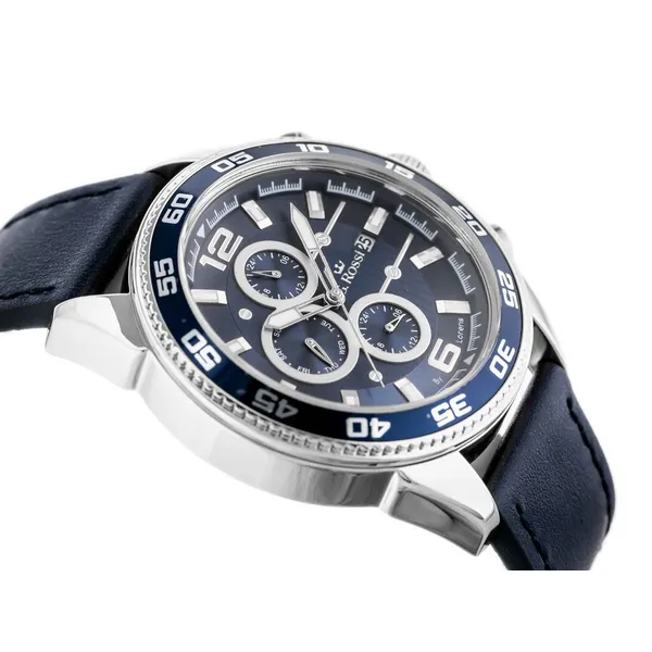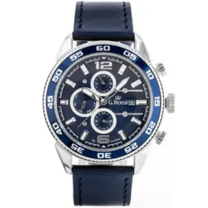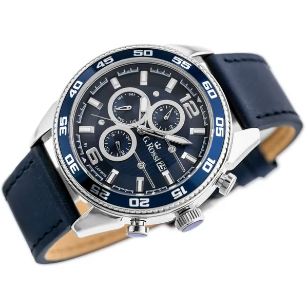 A G. Rossi férfi kvarc karóra stílusos választás a mindennapokra és alkalmi viselethez is. A sötétkék számlap és a hozzá illő kék bőrszíj harmonikus, kifinomult megjelenést ad, míg az ezüstszínű tok időtálló karaktert kölcsönöz az órának.