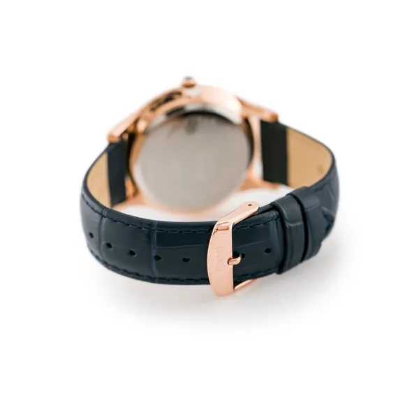 Elegáns férfi karóra rosegold tokkal, mélykék számlappal és japán Miyota quartz szerkezettel, amelyet ajándékdobozban szállítunk. Dátumablak, bőr szíj és ásványi üveg gondoskodik a precízióról, kényelemről és tartósságról.