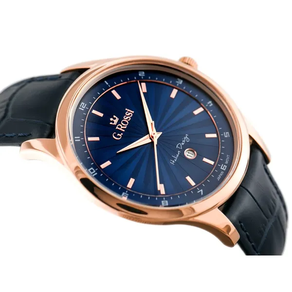 A G. Rossi 10212A2 férfi karóra elegánsan ötvözi a rosegold tokot és a mélykék számlapot, miközben a japán Miyota quartz szerkezet pontos időmérést garantál.