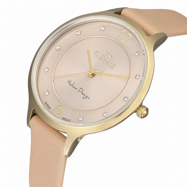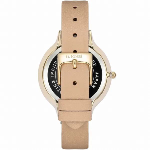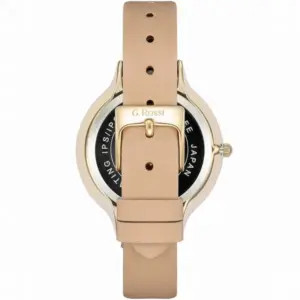 A G. Rossi női karóra elegáns választás mindennapi viseletre, amely a nőies megjelenést praktikus kialakítással ötvözi. A bézs természetes bőrszíj, az arany színű tok és a bézs számlap harmonikus, kifinomult összhatást teremtenek, így a modell könnyen illeszthető hétköznapi és alkalmi öltözékhez is.