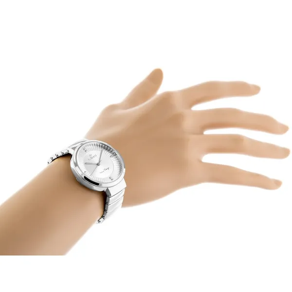 Elegáns, nőies megjelenésű кварc karóra ezüstszínű tokkal, számlappal és fém szíjjal. Az antiallergén IPS bevonat fokozott tartósságot biztosít, a kivehető szemeknek köszönhetően pedig a szíj kényelmesen méretre igazítható. A modell ásványi üveggel és WR30 vízállósággal készült, így ideális választás a mindennapokra.
