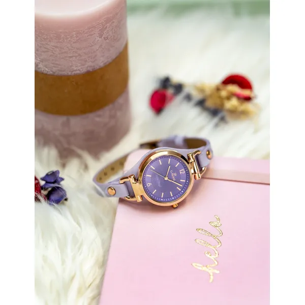 Elegáns, nőies karóra lila bőrszíjjal és rózsaarany színű tokkal, amely stílusos kiegészítő a mindennapokra és alkalmakra is. A japán szerkezet, az ásványi üveg és az antiallergén bevonat kényelmes, megbízható viseletet biztosít.