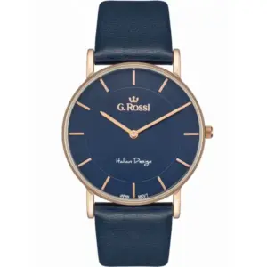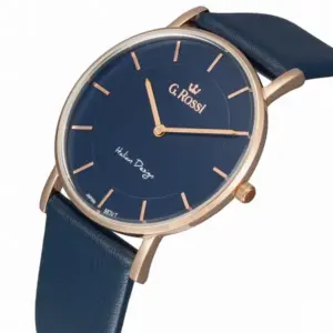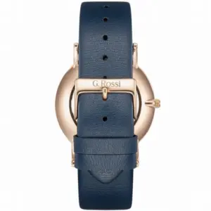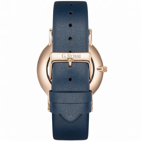 A G. Rossi G.R737A-6F3-2 modell kifinomult, nőies megjelenését a sötétkék természetes bőrszíj, a rózsaarany színű tok és a sötétkék számlap harmonikus összhatása adja. A rózsaarany színű indexek elegáns fényt és letisztult karaktert kölcsönöznek az órának. A WR30 vízállóság kényelmes, hétköznapi használatot biztosít.