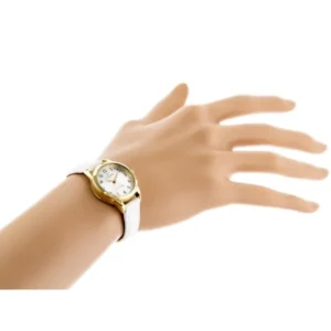 Japán Miyota szerkezetű, arany IPG bevonatú női karóra fehér bőrszíjjal és ezüst számlappal, amely eleganciát és allergénmentes kényelmet ad. A tartozék díszdoboz miatt azonnal ajándékozható.