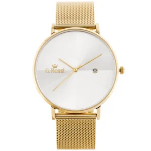 Az elegáns G. Rossi női karóra aranyszínű, rozsdamentes acélszíjával és ezüst számlapjával kifinomult megjelenést biztosít mindennapi viselethez és alkalmi öltözékhez egyaránt. A megbízható japán Miyota Citizen kvarc szerkezet pontos időmérést nyújt, míg az IPG allergiamentes bevonat óvja a bőrt és a felületet a kopástól.