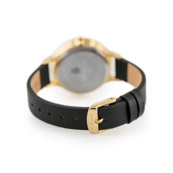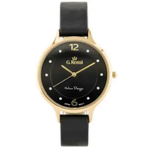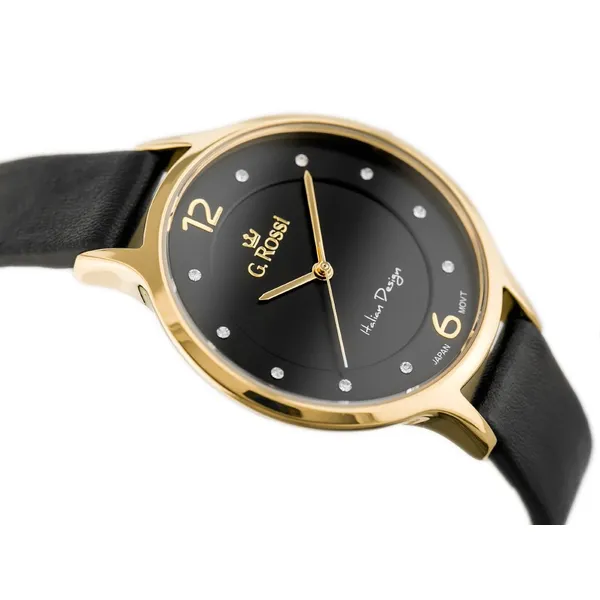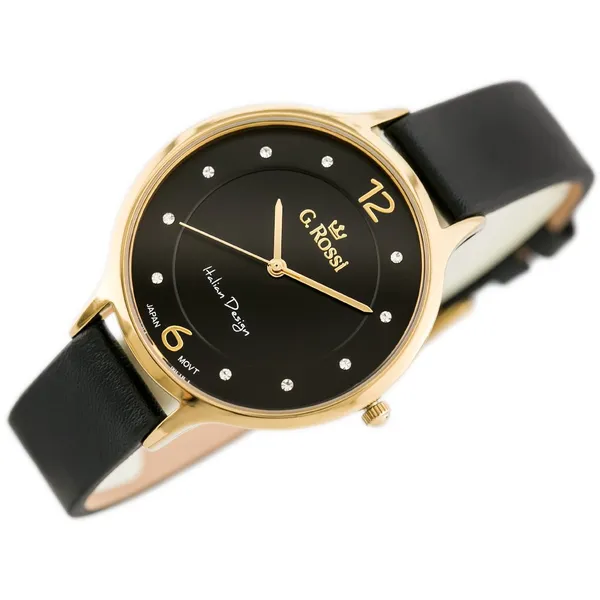 A G. Rossi női karóra elegáns és praktikus választás a mindennapokra. A fekete természetes bőrszíj, az aranyszínű tok és a fekete számlap harmonikus összhatást alkot, amely kifinomult megjelenést ad hétköznapi és alkalmi öltözékhez is. A számlapon található finom kristály indexek visszafogott csillogást kölcsönöznek az órának.