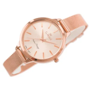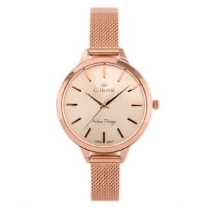 Az elegáns, teljesen rozéarany G. Rossi női karóra a japán Miyota kvarc szerkezettel megbízható pontosságot, az antiallergén IPR bevonat pedig kényelmes viseletet garantál. A nőies, 37 × 45 mm-es tok és a mindössze 8 mm vastagság finom megjelenést kölcsönöz, miközben a 3 ATM vízállóság a mindennapokban is védi az órát.