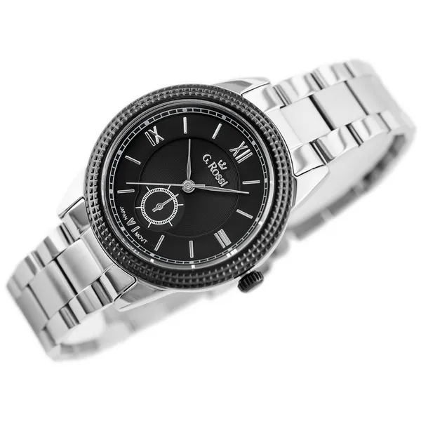 Elegáns, nőies megjelenésű G. Rossi karóra fekete számlappal és ezüstszínű fém szíjjal. A megbízható Miyota kvarc szerkezet japán gyártású, így pontos működést biztosít a mindennapokban. Az antiallergén IPS bevonat hozzájárul a tartóssághoz és a kényelmes viselethez, míg a kisebb mutató a számlapon dekoratív részletként emeli ki az óra stílusát.