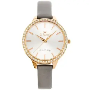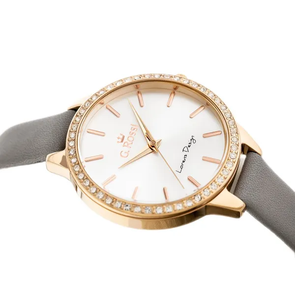 Elegáns, nőies megjelenésű G. Rossi karóra mindennapi viselethez és alkalmi összeállításokhoz. A japán Miyota Citizen kvarc szerkezet megbízható működést biztosít, míg az antiallergén IPR bevonat nagyobb kényelmet és tartósságot nyújt. A rózsaarany színű tok, az ezüst számlap és a szürke bőrszíj harmonikus, kifinomult összhatást teremt.