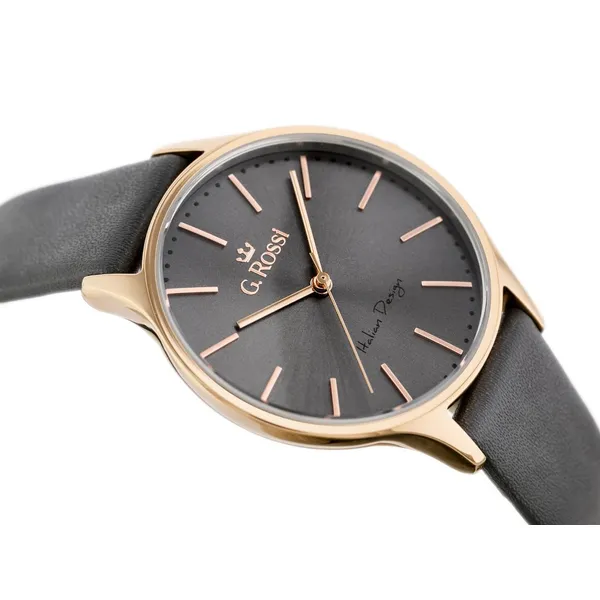 A G. Rossi női karóra letisztult, elegáns megjelenésével könnyen illeszkedik a mindennapi és alkalmi öltözékekhez. A szürke számlap, a szürke bőrszíj és a rózsaarany színű tok harmonikus, nőies összhatást teremt, miközben a minőségi kidolgozás kényelmes viseletet biztosít.
