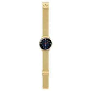 Az óralap testreszabható, akár saját fénykép is beállítható háttérként, emellett az alkalmazásból további számlapok tölthetők le. A kerek számlap és az aranyszínű tok, valamint a rozsdamentes acél szíj elegáns megjelenést kölcsönöz.