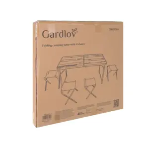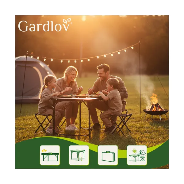 Gardlov összecsukható kerti asztal 4 székkel praktikus választás kertbe, teraszra, erkélyre, kempingezéshez vagy piknikhez. A szett kompakt bőrönd formára csukható, így könnyen szállítható és kis helyen tárolható. Csak nyissa ki, állítsa be a kívánt magasságot, és már használhatja is.