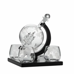 Elegáns, látványos ajándékszett whiskyrajongóknak és az utazás szerelmeseinek. A glóbusz formájú karafka belsejében kézzel készített, miniatűr vitorlás található, amely különleges 3D hatást kelt, és stílusos dísze bármely bárpultnak. Az egész készlet egy félhold alakú, masszív fa állványon kap helyet, szállításhoz pedig minden elem gondosan rögzített.