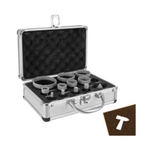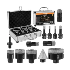 Kemény burkolatokhoz és kőhöz tervezett gyémánt lyukfűrész készlet, amellyel tiszta, pontos furatokat készíthet kevesebb lepattanással. M14 rögzítéssel sarokcsiszolóhoz illeszkedik, az adapterrel fúrógéppel is használható, a hordtáska pedig megkönnyíti a rendezett tárolást és a szállítást.