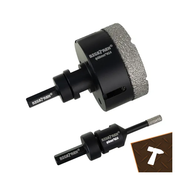 Pontos, tiszta furatok kemény burkolatokban: a vákuumforrasztott gyémántszemcsék gyors fúrást és kevesebb lepattanást adnak. Az M14-es kialakítás sarokcsiszolóval használható, a mellékelt adapterrel pedig hagyományos fúróval is dolgozhat, így egy készlet több feladatra elég.