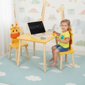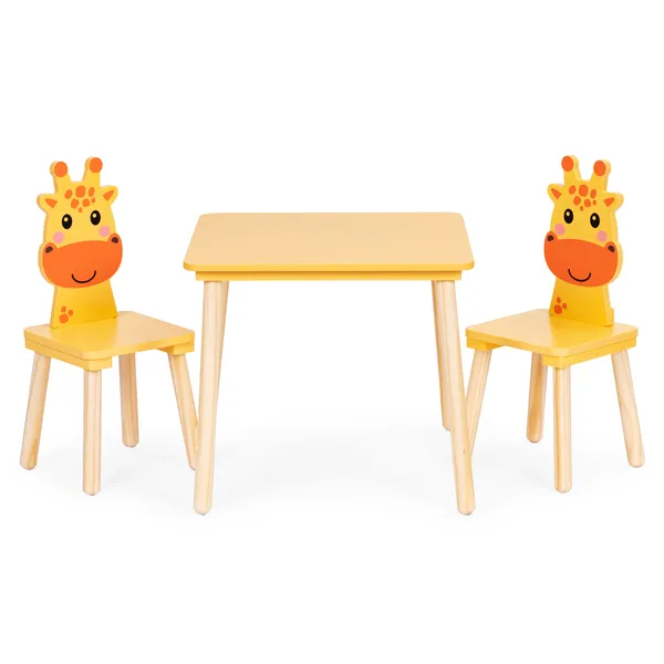 A stabil fa asztal és a két, zsiráf formájú szék vidám, ergonomikus ülőhelyet biztosít, miközben a lekerekített élek és a gyerekbarát magasság gondoskodnak a biztonságos, kényelmes játéktérről.