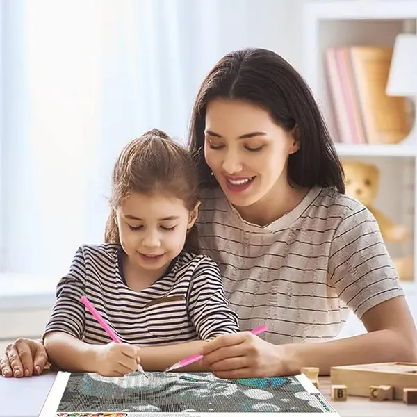 Kreatív, nyugtató elfoglaltság gyerekeknek és családi programnak: csillogó kövecskékkel könnyen elkészíthető, látványos kép. A kerek keret és a támaszték miatt a kész alkotás azonnal kiállítható, ajándéknak is szuper.