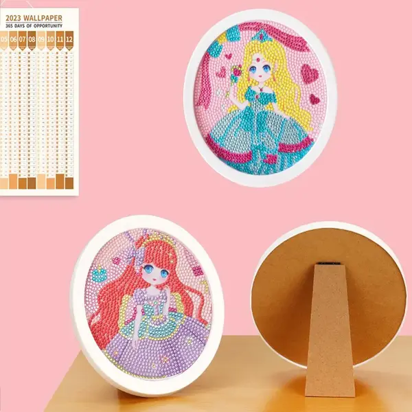 A csomagban kerek keretben érkező kép támasztékkal rendelkezik, így elkészítés után könnyen kiállítható. A nehézségi szintet gyerekeknek megfelelően választott mintához igazítják.