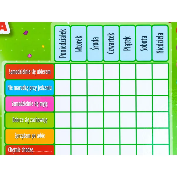 A hét első napján együtt határozzátok meg a feladatokat és a jutalmat, majd minden este jelöljétek a teljesítést a táblán a mellékelt törölhető filccel. Pozitív jel = 1 pont, negatív jel = 0 pont. A hét végén számoljátok össze a pontokat; ha a kitűzött célt elérte a gyermek, következik a megérdemelt jutalom.