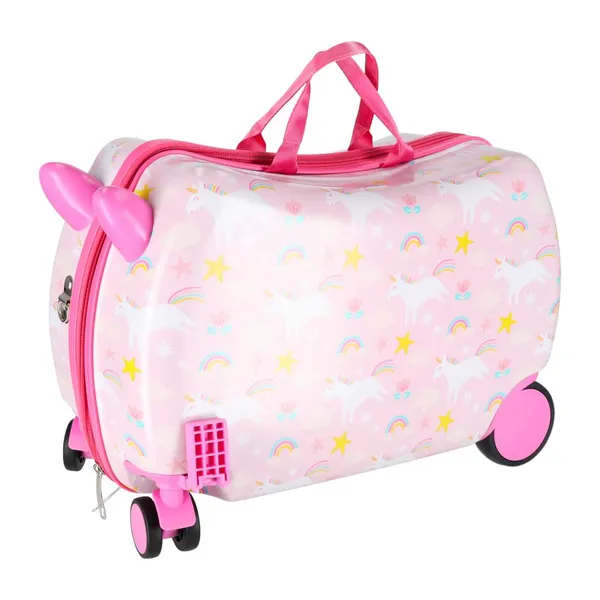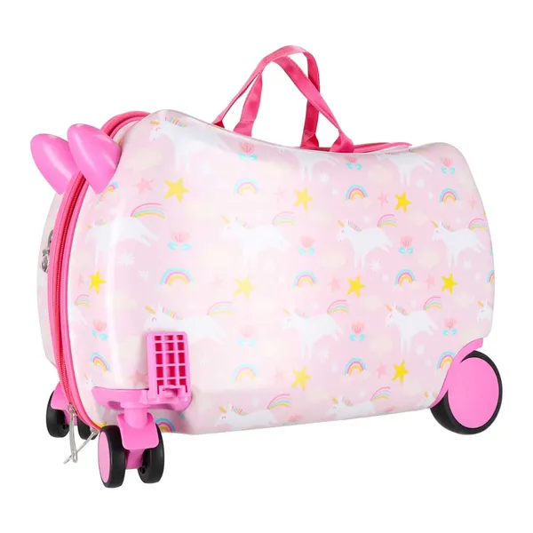 Gyerek kézipoggyász bőrönd kerekeken, unikornis mintával, ülőkével