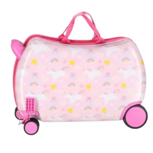 Ülőkés, kerekes gyerek bőrönd unikornis mintával, amelyet a kicsi is könnyen kezel, a szülő pedig kényelmesen húzhat pánttal a repülőtéren vagy utazás közben. Csendesen gurul, jól manőverezhető, és segít rendezetten tartani a gyerek holmijait rövidebb és hosszabb utak során.