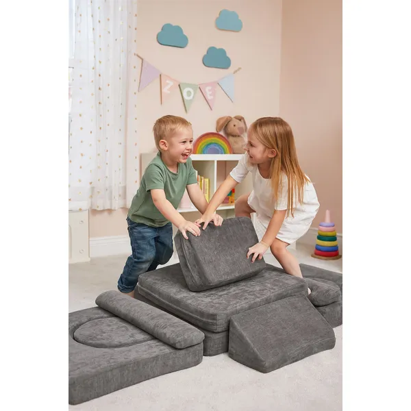 Kétszemélyes, 10 részes moduláris kanapé kreatív játékhoz és pihenéshez. A puha chenille kárpit és a rugalmas habszivacs kényelmes ülő- vagy fekvőfelületet biztosít, miközben a párnák szabadon variálhatók, így házikó, vár vagy alagút is épülhet belőlük.