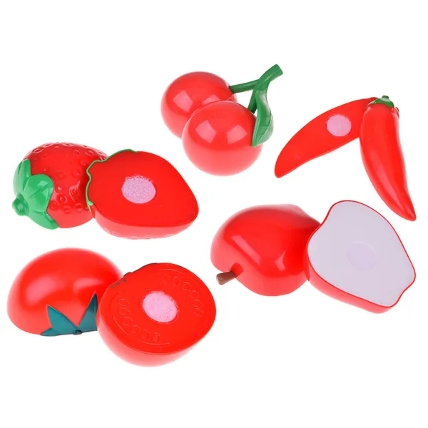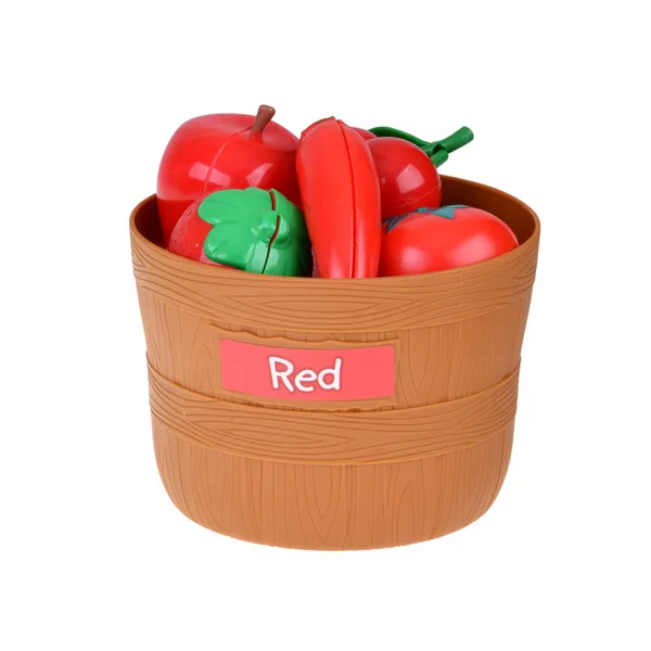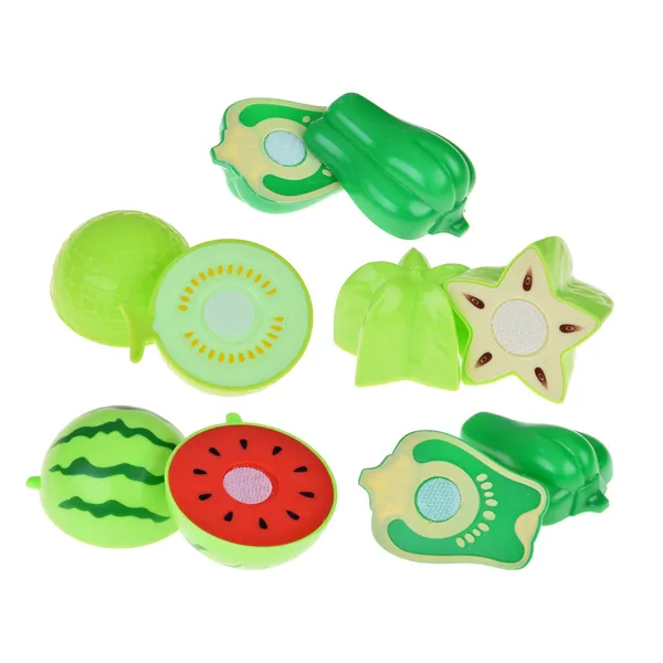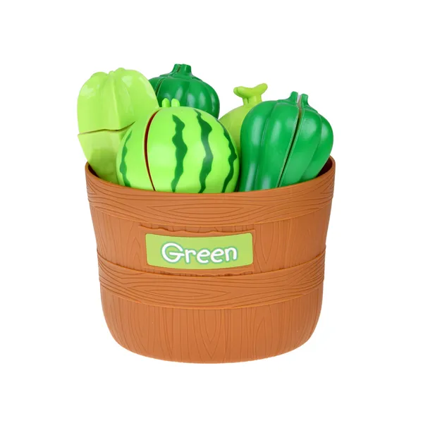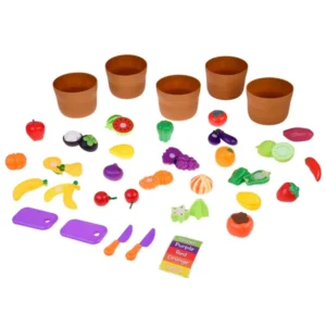 A műanyag zöldségek és gyümölcsök tépőzárral kapcsolódnak össze, így a mellékelt kések segítségével újra és újra kettévághatók, majd összerakhatók. Az 5 színes tálban a kicsik szín szerint válogathatják a terméseket, ami segíti a színek felismerését és a rendszerező gondolkodást.