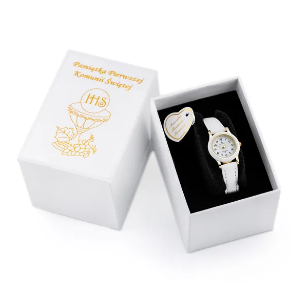 Gyermek karóra fehér bőrszíjjal, arany indexekkel, elsőáldozási díszdobozban