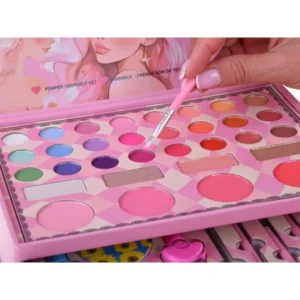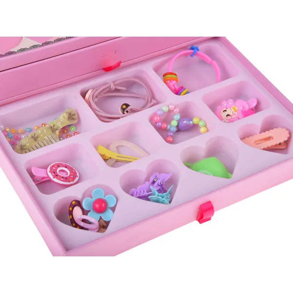 Varázslatos sminkdoboz a kis hercegnőknek: 3 szintnyi színpompás smink, köröm- és hajkiegészítő, valamint csillogó ékszerek egy stílusos, rózsaszín, mágneszáras tárolóban (24,5×17,5×8,5 cm).